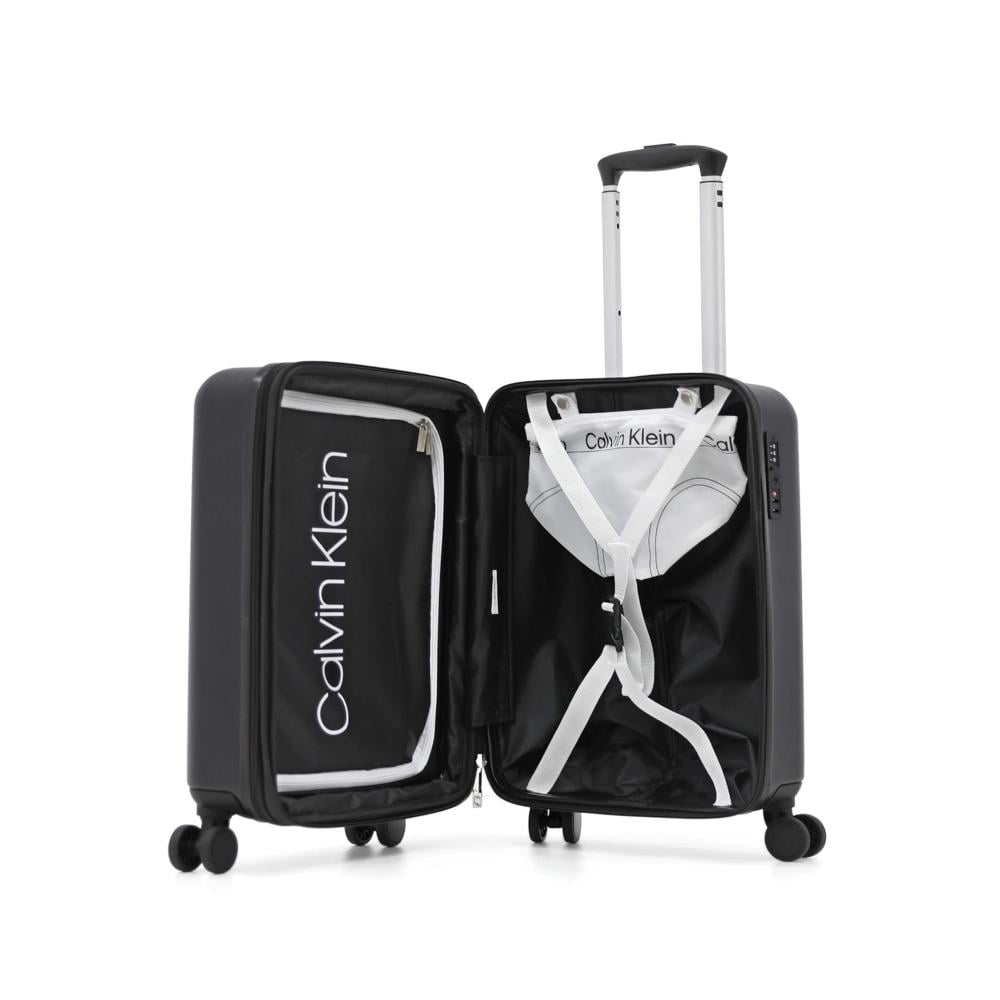 حقيبة سفر ترولي مقاس صغير كالفن كلاين - لون اسود بتصميم مميز يتسع لجميع أغراضك الهامة التي تحتاجها أثناء رحلاتك. شنطة كابينة الطائرة سهلة الحمل والتنقل بها، بالإضافة إلى مقاومتها للكسر والصدمات