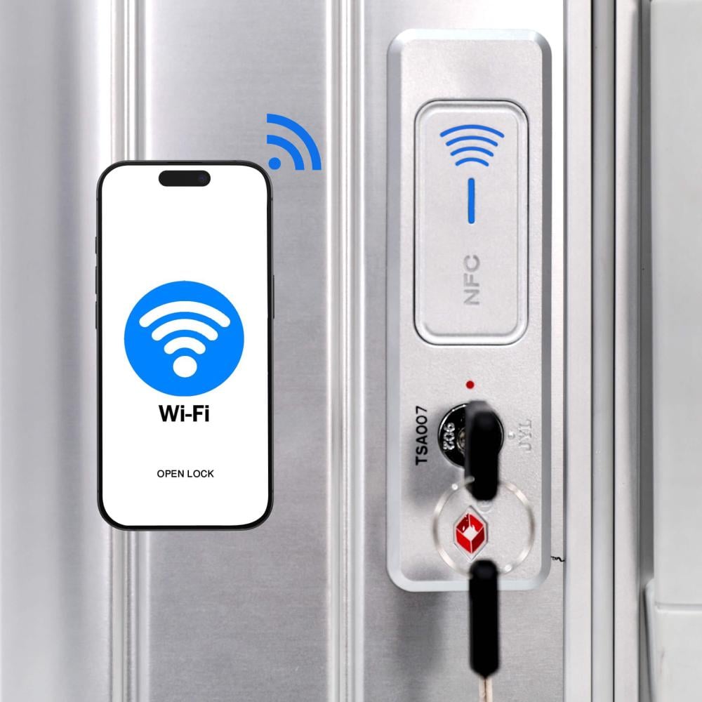 3-اضغط على زر التشغيل الموجود في دخل الشنطة حتى تضئ بلون الزرق ثم مرر البطاقة على منطقة المسح NFC حتى يتغير الون الى الون الوردي ويصدر صوت فيتم التسجيل البطاقة بنجاح