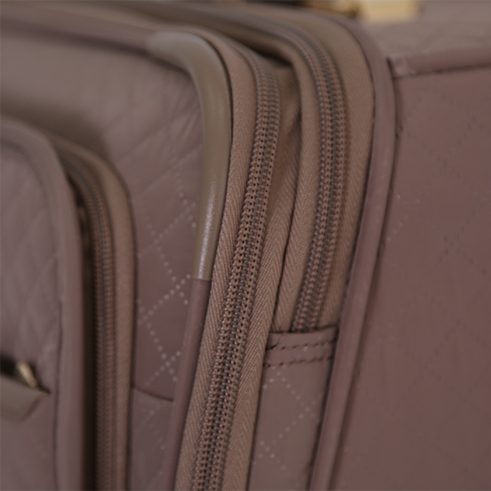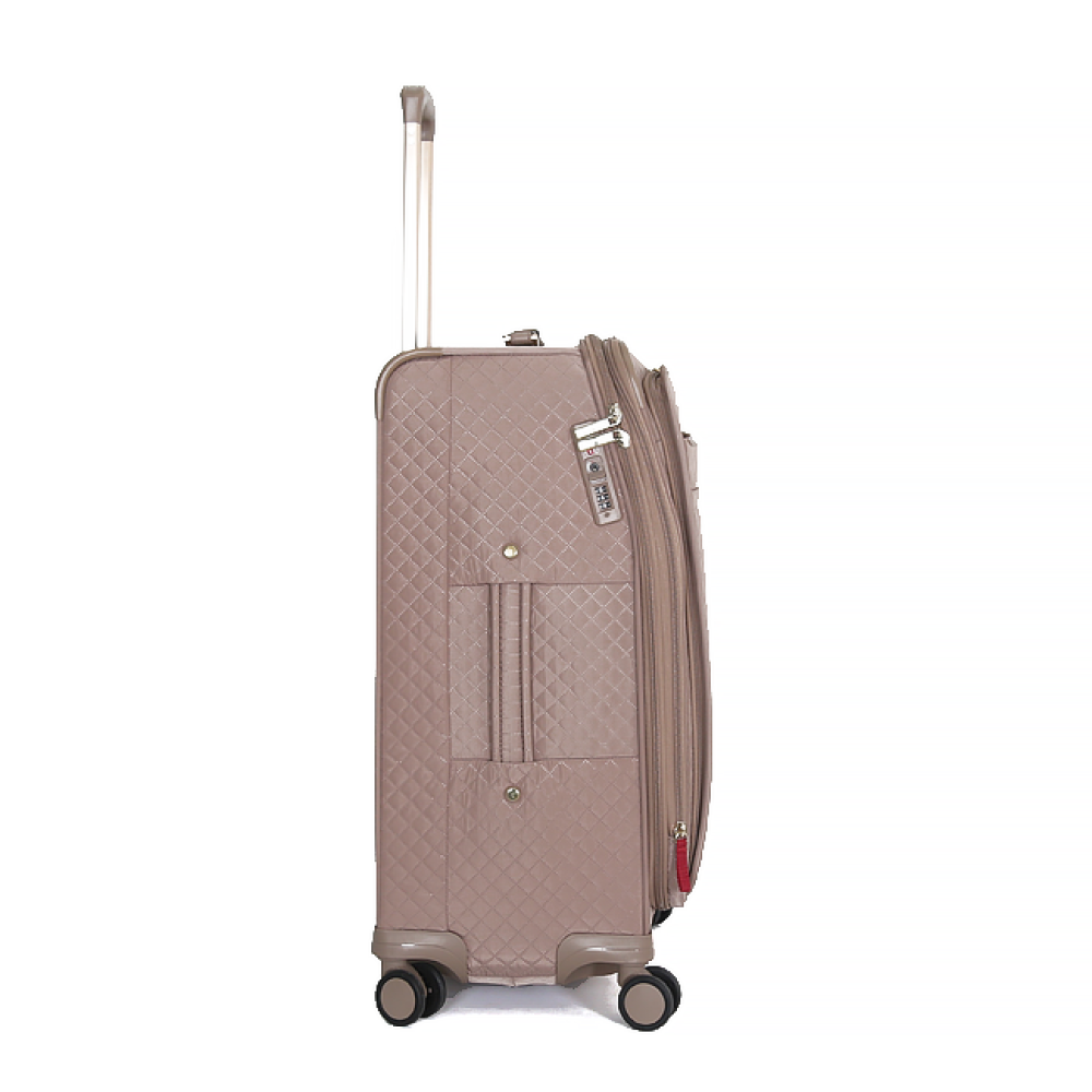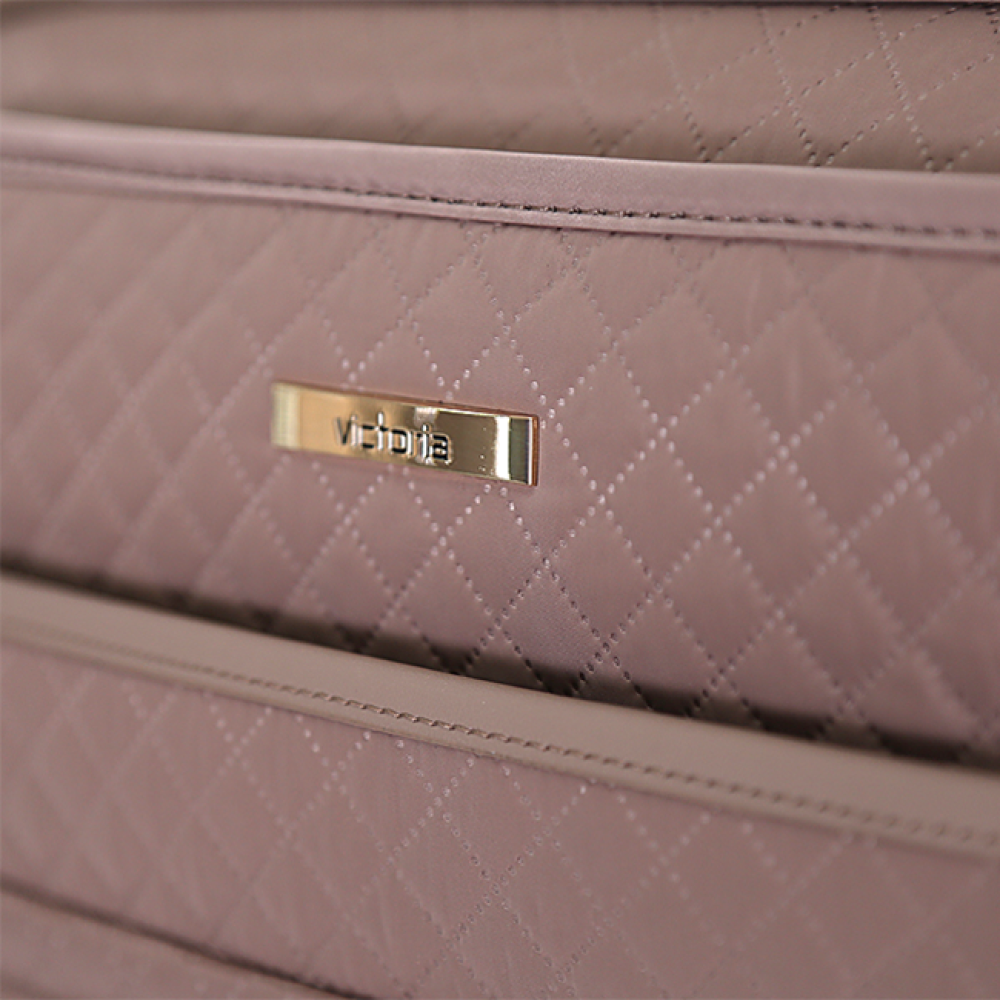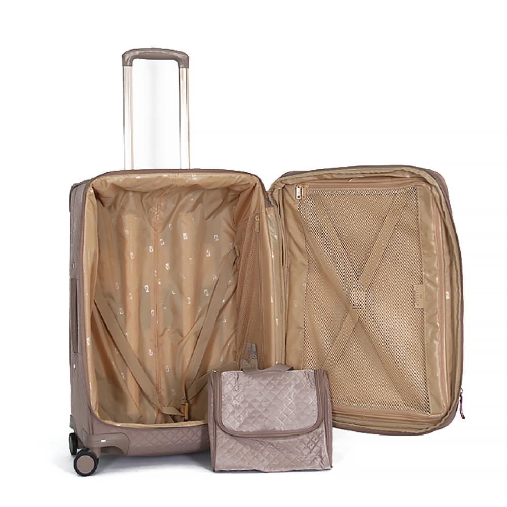 The Victoria Coffee-colored five-piece luggage set is made of durable, high-quality fabric and meets all your travel needs, whether your trip is short or long. The set includes three trolley bags in different sizes : large, medium, and cabin-sized . Each comes with a plastic cover to protect it during storage or travel. It also includes a shoulder bag and a makeup bag.